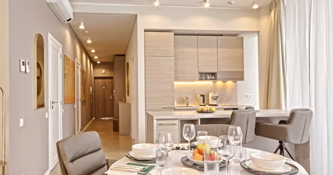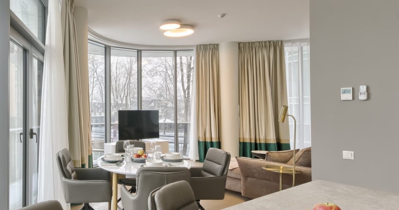 100M2 – 2 Schlafzimmer, Wohnzimmer, Balkon und Garage unter dem Haus. Neue, moderne, hochwertig eingerichtete, stilvolle Wohnung im Zentrum von Druskininkai, geeignet für kurz- und langfristiges Wohnen. Geräumiges Wohnzimmer, zwei Schlafzimmer mit hochwertigen Möbeln, Schlafsofa mit Matratze und Kinderbett für bis zu 7 Personen. Der Esstisch bietet Platz für bis zu 8 Personen, eine Insel mit Barhockern und ein bequemes Sofa. TV mit mehreren Kanälen, Wifi, Fußbodenheizung, Klimaanlage, Panoramafenster, Nachtvorhänge – alles wurde von einem professionellen Innenarchitekten durchdacht und eingerichtet. Für Ihre Bequemlichkeit gibt es einen Parkplatz mit Aufzug unter dem Haus, viele Hotels, einen Wasserpark, ein Restaurant. Voll ausgestattete Küche und sehr komfortable Einrichtung – Sie können kochen und Sie werden das Haus nicht verlassen wollen, weil es sehr schön und ruhig ist, die Aussicht aus den Fenstern ist fabelhaft, der Park, die Kirche, die Gasse.