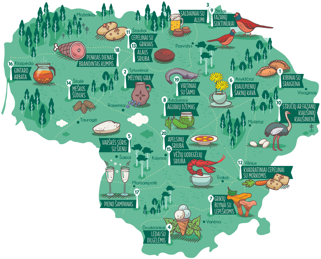 www.lithuania.travel sukūrė žemėlapį, kuriame rasite net 20 netikėtų skonių – nuo apelsinų sriubos iki varškės su šienu. Druskininkuose netikėto skonio titulą laimėjo dilgėlių ledai, kuriuos gamina ir parduoda restoranas Velvetti.