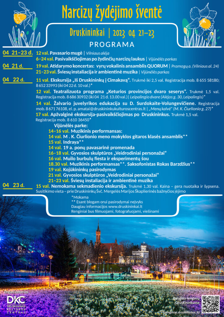 Vėjyje švelniai siūbuojat narcizų karūnoms, parkas taps tikra ramybės ir harmonijos oaze. Jutiminius įspūdžius sustiprins sklindančios gyvos muzikos melodijos. Dienos metu skambės švelnūs gitarų garsai, romantiškos saksofono improvizacijos, o druskininkietė atlikėja Indraya savo dainomis ir pulsuojama gera energija neleis nuo jos atitraukti akių. Svajinga, jauki, šilta ir kvepianti atmosfera kvies sukti ratus takais ir tiesiog  grožėtis vaizdais.