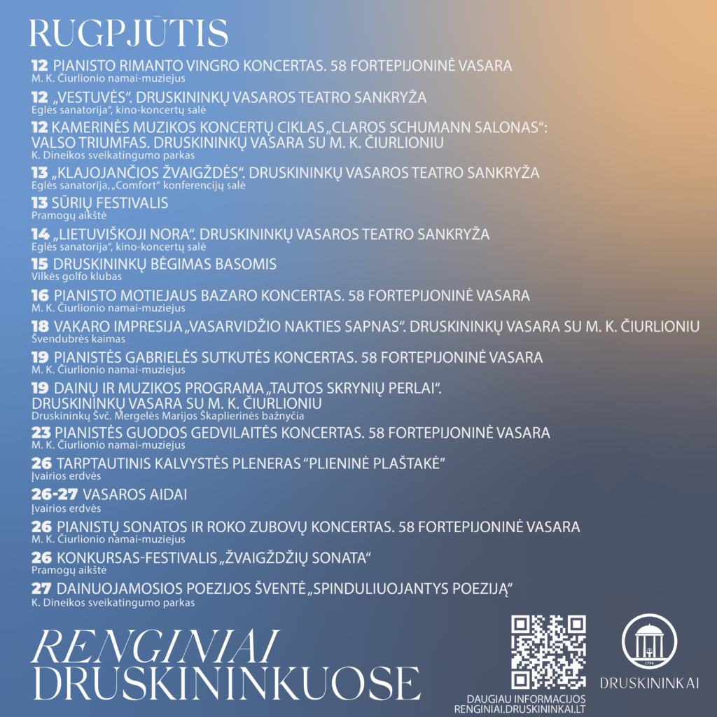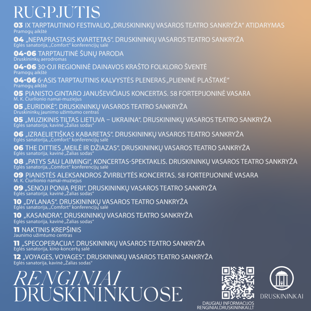Vasaros paskutinis mėnuo prasidės Tarptautinio teatro festivalio „Druskininkų vasaros teatro SANKRYŽA“ atidarymu, o spektakliais druskininkiečiai ir miesto svečiai galės mėgautis visą rugpjūčio mėnesį. Rugpjūčio pirmą savaitgalį miestą užplūs šunų mylėtojai, susirenkantys į tarptautines šunų parodas. Šį savaitgalį taip pat vyks jubiliejinė 30-oji respublikinė Dainavos krašto folkloro šventė, skirta Dzūkijos (Dainavos) krašto metams paminėti, kartu su 6-ąja tarptautiniu kalvystės pleneru „Plieninė plaštakė“. Savaite vėliau sugūžės gurmanai ir profesionalūs sūrininkai į Sūrių festivalį, kurio metu vyks parodomoji sūrio gamyba, degustacijos, konkursai, kūrybinės dirbtuvės vaikams, koncertas bei daug kitų skanių linksmybių. Vasaros pabaigą vainikuos tradicinė „Vasaros aidų“ šventė bei dainuojamosios poezijos šventė „Spinduliuojantys poeziją“. O taip pat visą rugpjūčio mėnesį tęsis XXI tarptautinis menų festivalis „Druskininkų vasara su M. K. Čiurlioniu“ skirtas 148-osioms Čiurlionio gimimo metinėms.
