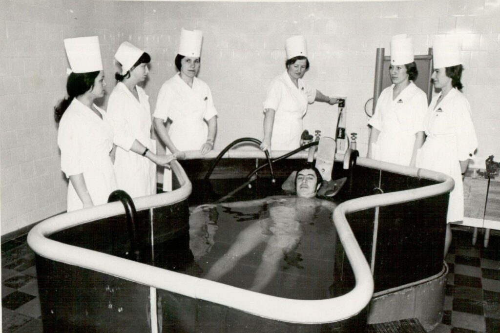 Nuotraukoje: povandeninis masažas mineralinio vandens vonioje, apie 1980. Nuotrauka: Druskininkų gydykla.