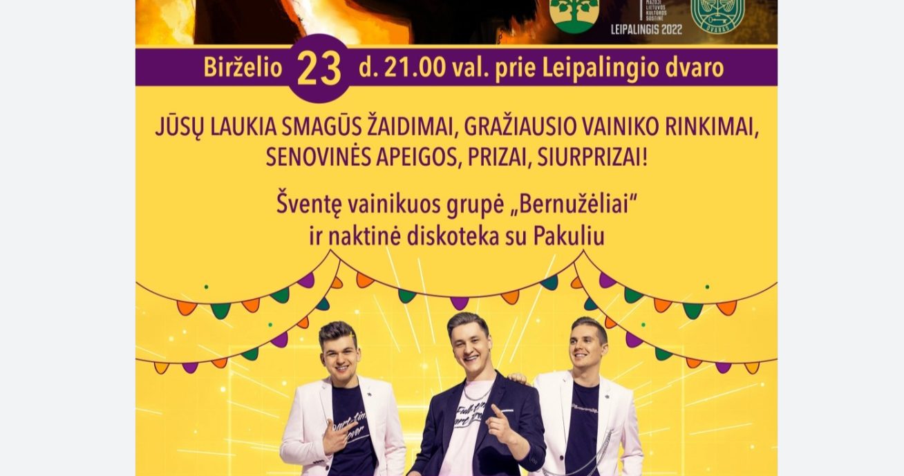 Šalia gražiausio Druskininkų krašto dvaro, Leipalingio miestelio bendruomenė kviečia jungtis į Joninių nakties šėliones. Renginyje jūsų laukia smagūs žaidimai, gražiausio vainiko rinkimai, senovinės apeigos ir šventinis grupės „Bernužėliai” pasirodymas.