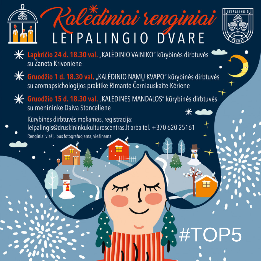 Leipalingio dvaras Gruodžio 1 d. 18:30 val. kviečia į kūrybines dirbtuves, kurių metu kartu su aromapsichologijos praktike Rimante Černiauskaite turėsite galimybę susikurti unikalų Kalėdinį namų kvapą, kuris pakels jūsų ir svečių nuotaiką, skatins nuoširdų bendravimą ir džiugesį. Visos medžiagos bus duotos. Kūrybinių dirbtuvių kaina – 5 Eur. Registracija: leipalingis@druskininkukulturoscentras.lt arba tel.: +370 620 25161.