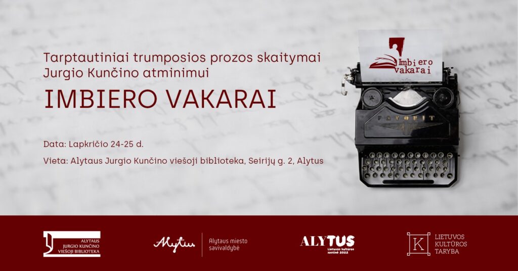 Lapkričio 24–25 d. Alytaus Jurgio Kunčino viešojoje bibliotekoje (Seirijų g. 2, Alytus) vyks dešimtieji tarptautiniai trumposios prozos skaitymai „IMBIERO VAKARAI“, ypatingi ne tik sukaktimi, bet ir išlaikytu savitumu – naujutėliais, dar niekur nepublikuotais tekstais. Tai vienas iš svarių „Alytaus – Lietuvos kultūros sostinės 2022“ renginių. Susirinkę trumposios prozos „suokalbininkai“, tikri geros šiuolaikinės literatūros gurmanai, su pasimėgavimu atvers jutimus jaukiems susitikimams su rašytojais, specialiai šiam įvykiui paruošusiems išskirtinius kūrinius. Daugiau informacijos: https://fb.me/e/2f5VEwpLK