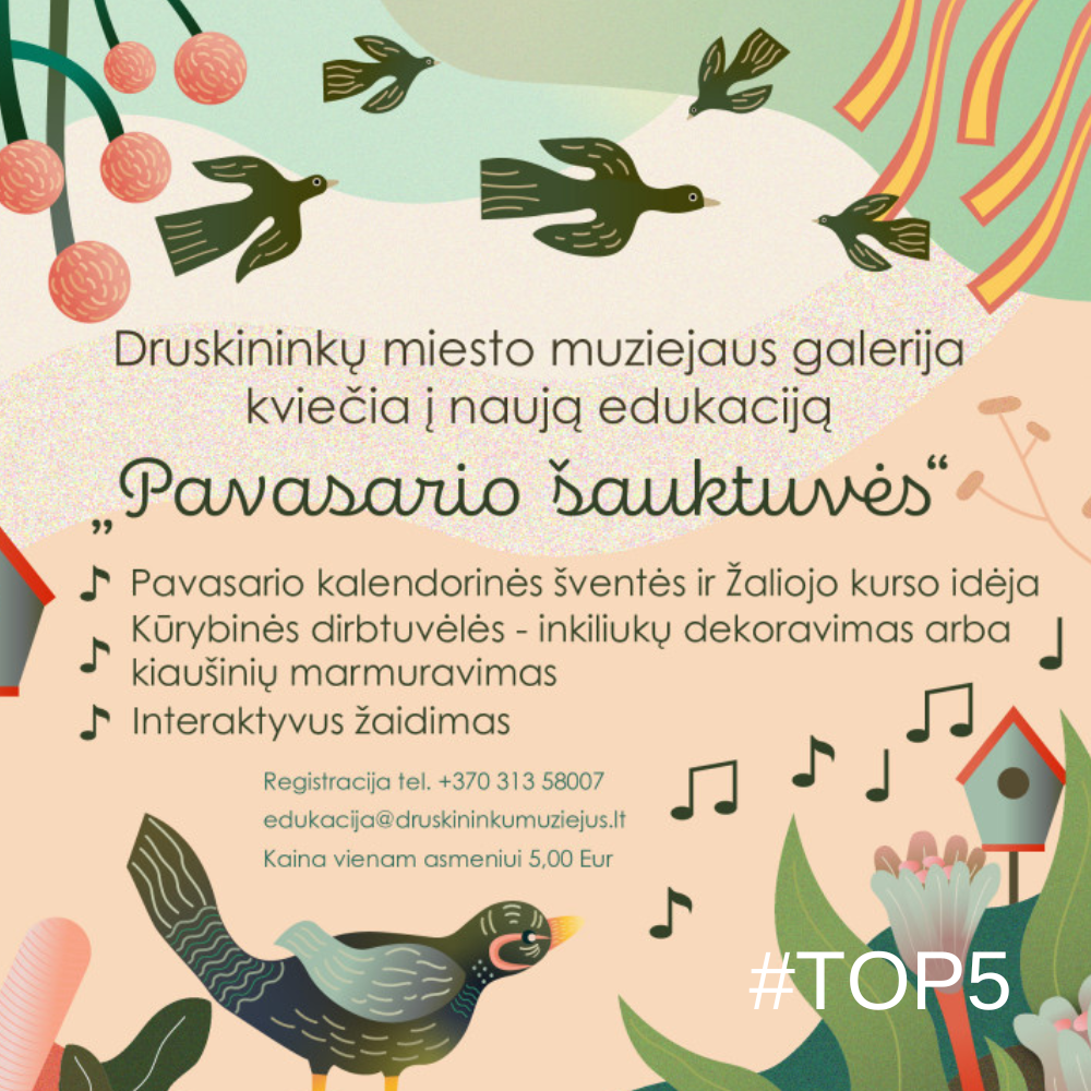 Druskininkų miesto muziejaus galerija kviečia į naują edukaciją „Pavasario šauktuvės“. Kai į dangų pakyla pirmaisiais pavasario šaukliais vadinami vieversiai, atgimsta gamta ir dovanoja mums daugybę naujų potyrių, nuostabos bei įkvepiančių emocijų. Visa tai kviečiame patirti naujoje Druskininkų miesto muziejaus galerijoje rengiamoje edukacijoje. Daugiau informacijos apie edukaciją rasite čia.