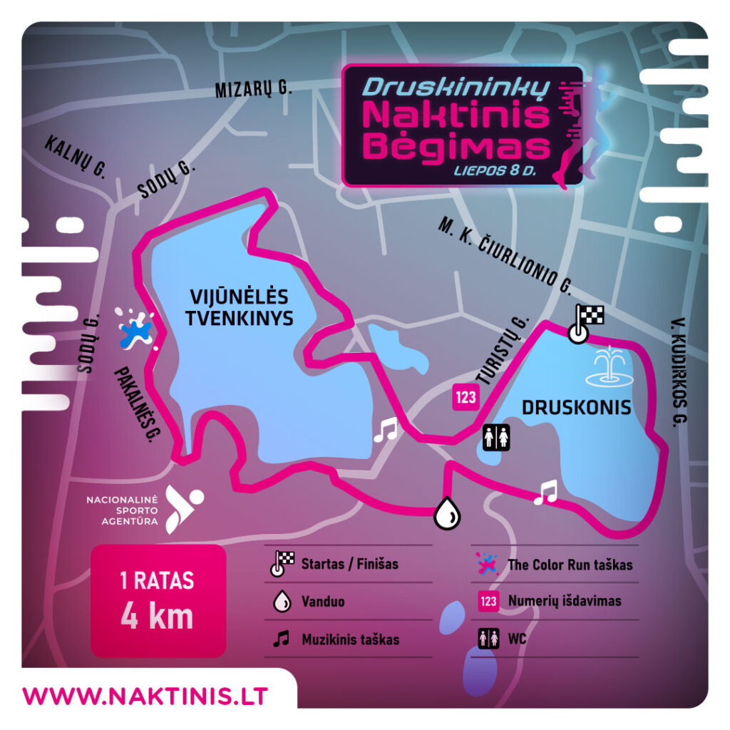 4 km ilgio bėgimo trasa drieksis palei patį Druskininkų grožį – Druskonio ežerą ir Vijūnėlės tvenkinį. 8 ir 12 km bėgimų dalyviams atitinkamai teks įveikti du arba tris ratus. Kadangi tai bus ne tik sportas, bet ir savotiškas šviesų ir pramogų šou, renginio organizatorius Evaldas Martinka ragina visus dalyvius nebijoti pasipuošti ryškiomis spalvomis ar nuotaikingomis aprangomis.