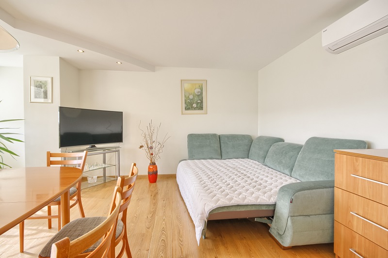 W apartamencie znajduje się rozkładane łóżko i łóżeczko dla dziecka, więc apartament może pomieścić do 5 osób.