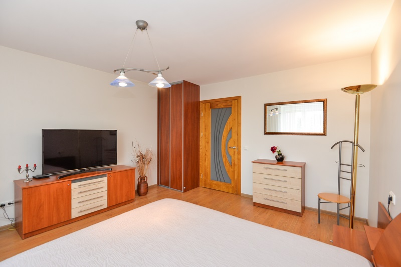 W sypialni znajduje się podwójne łóżko 160-200 cm, telewizor z szerokim ekranem, balkon.